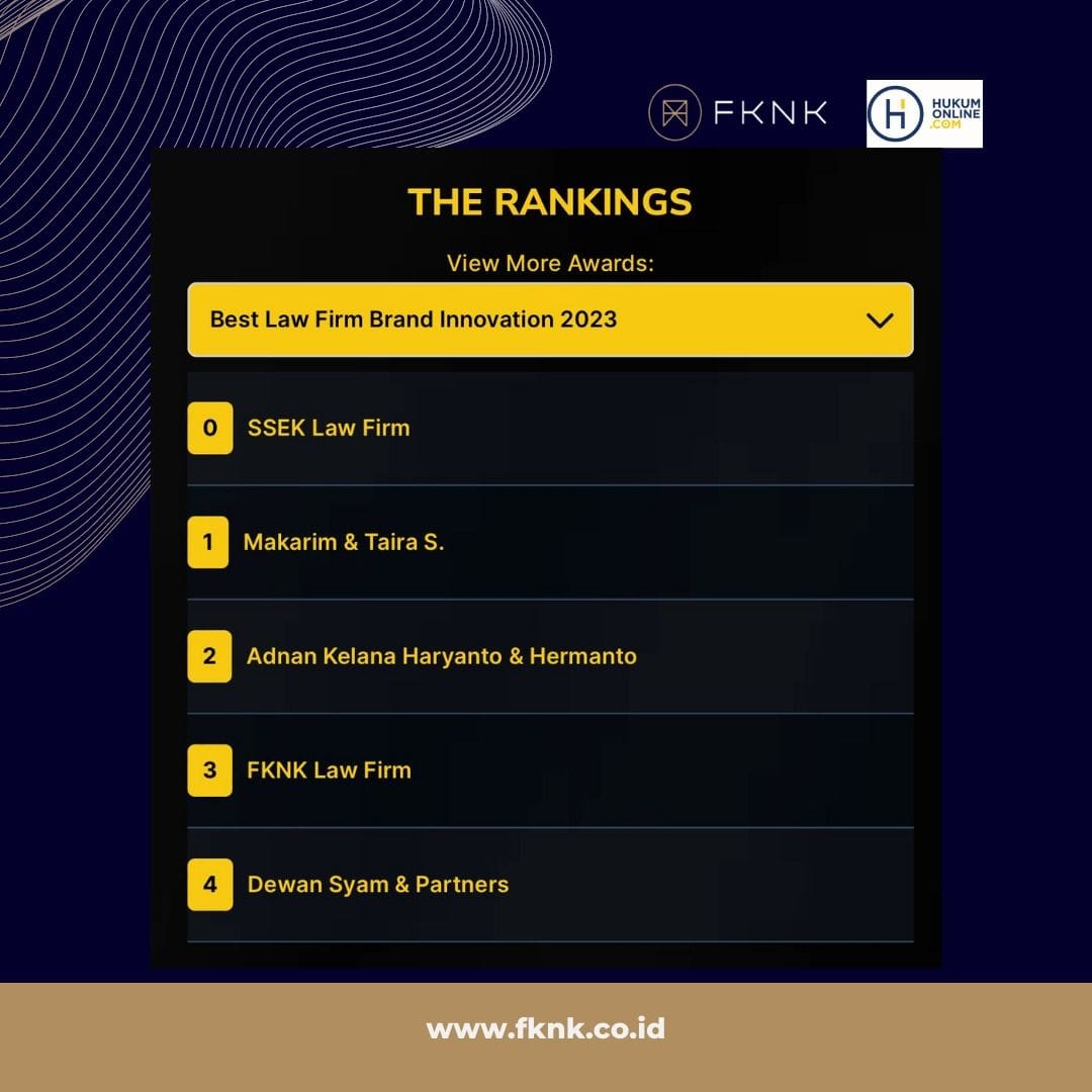 Being named as one of the Top 100 Indonesian Law Firms is a testament to our commitment to excellence. We are also honored to be nominated for Brand Innovation 2023, showcasing our dedication to staying ahead in a rapidly evolving legal landscape.